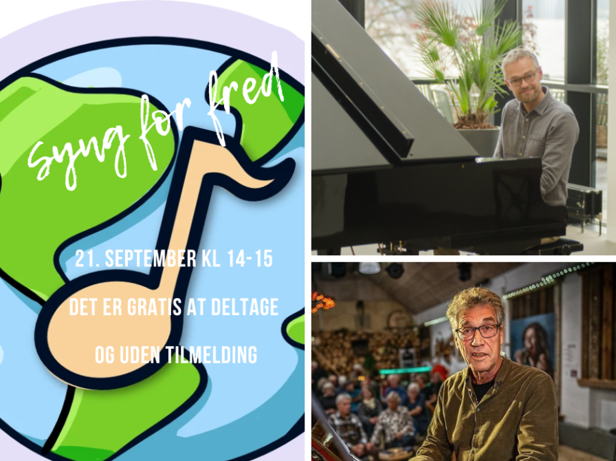 Vi har hele to steder, hvor du kan deltage i Syng for fred. Du kan møde op på Galten Bibliotek, hvor tidligere forstander på Ry Højskole Ole Toftdahl sidder ved klaveret. På Rådhusloftet ovenpå Hørning Bibliotek, sidder bibliotekschef Jens-Ole Winther ved tangenterne. Begge vil følge jer trygt igennem et repertoire af dejlige fællessange og afslutter med "What a wonderful World"