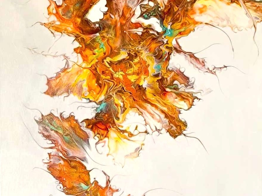 Galten BibliotekEtly fortæller om maleteknikken: ” Akrylfarver blandes med et produkt, der hedder pouring medium samt lidt vand – og dermed får det farverne til at blande sammen og ind i hinanden på meget flotte måder. Intet er givet på forhånd og malingen får sit helt eget liv, når jeg har lavet basen og efterfølgende lægger forskellige lag af farver ovenpå hinanden – herefter bruger jeg ofte en føntørre eller andre små metoder til at få farverne til at få liv – og gerne liv med dejlige farver ”