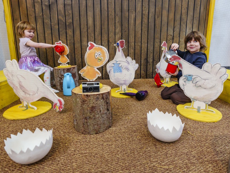 Velkommen i en hønsegård, som er helt almindelig og så alligevel ikke. Faktisk er den ret ualmindelig og helt sin egen. Med en masse store, bløde høns og kyllinger, skøre rekvisitter og kostumer kan børnene skabe deres egne fortællinger og historier.