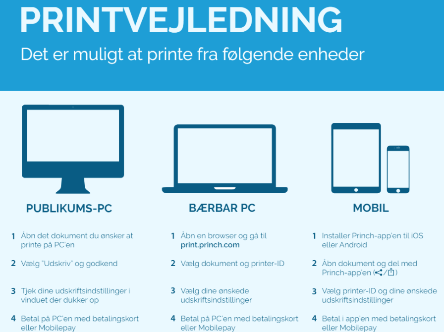 Skanderborg Kommunes Biblioteker benytter tjenesten Princh, hvor du både kan printe fra vores computere, fra din egen bærbare pc, fra en tablet eller din smartphone.