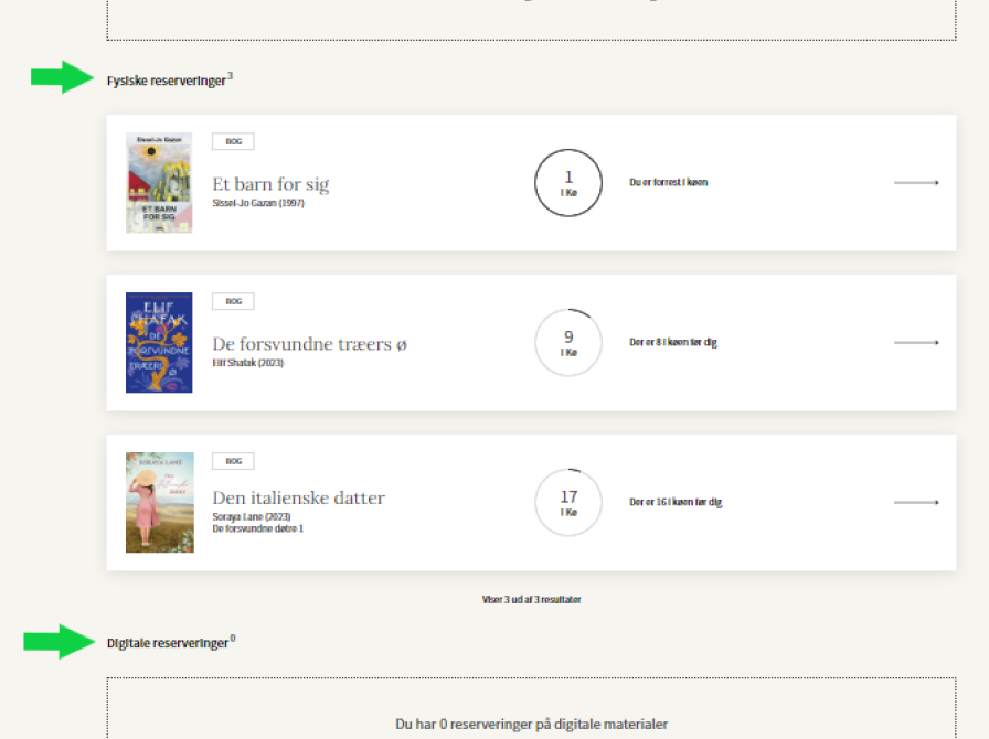 Siden er opdelt i: ”Klar til afhentning”, ”Fysiske reserveringer” og ”Digitale reserveringer”.